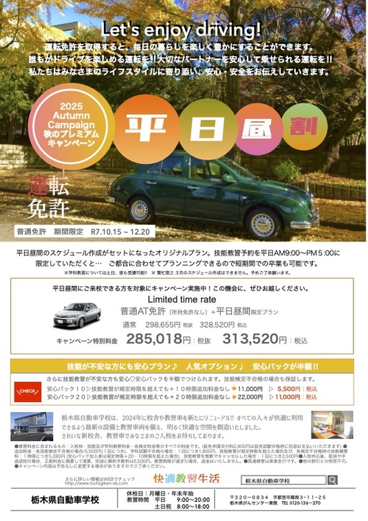 【普通免許】秋のプレミアムキャンペーン♪ 平日昼割