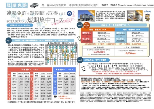 冬・春休みを利用して短期間で免許取得が可能な「短期集中コース」!!「短期集中コース」なら合宿教習所に行かなくとも、自宅からの通学で最短3週間(普通免許AT)で卒業可能なプランです。✨予約制、人数制限がございますので、ご希望の方はお電話にて空き情報をご確認ください。